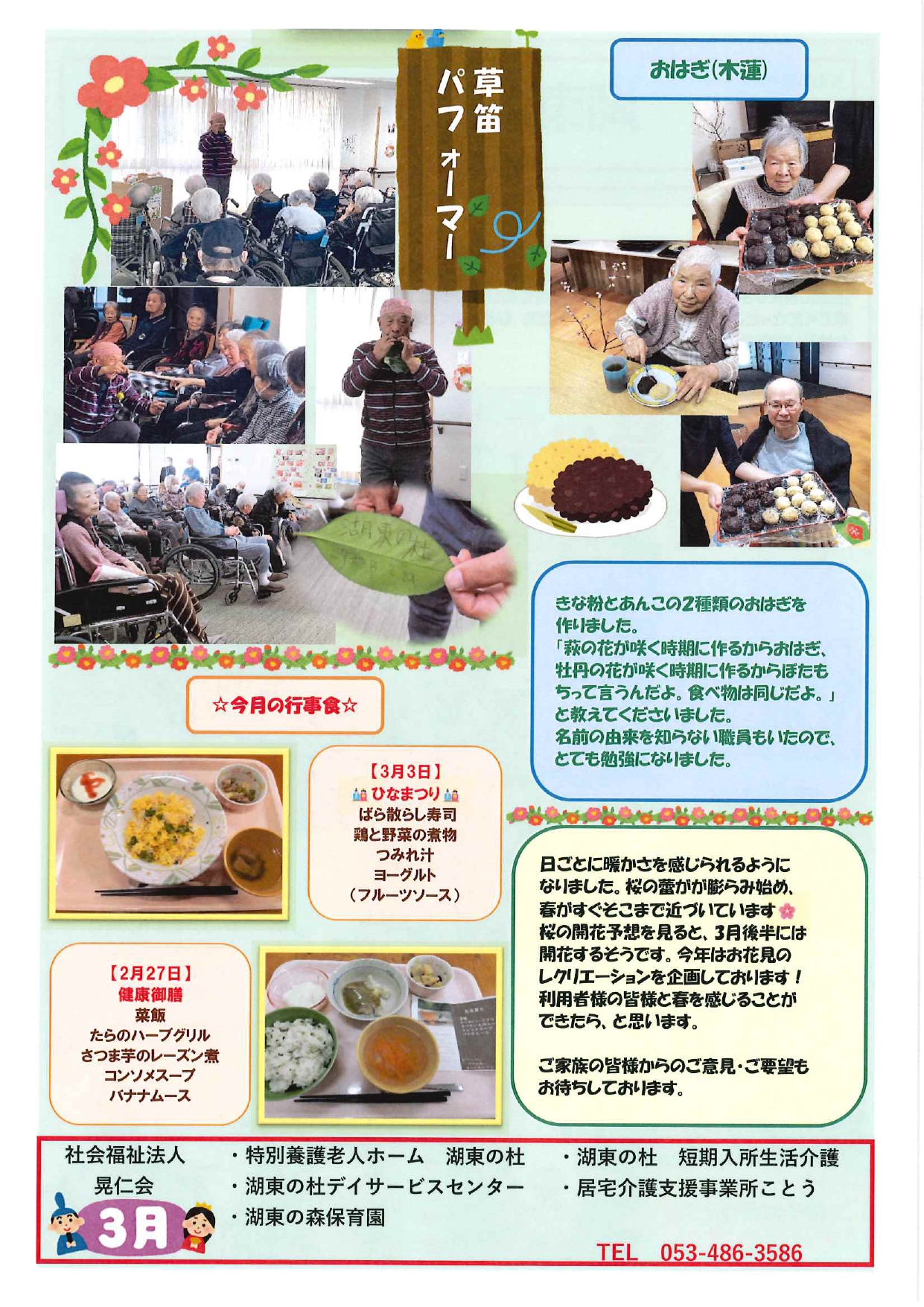 桜の季節です 桜の便りが次々聞かれるようになりました。 年々開花の時期が早くなっている気がします。 施設内に桜の木があるので、満開になる日が待ち遠しいです。 暖かくなってきたので、利用者様とお散歩に行けたらと思います。 さて、『湖東の杜通信』の3月号が完成しましたので、どうぞご覧ください。 ※クリックすると画像が拡大します