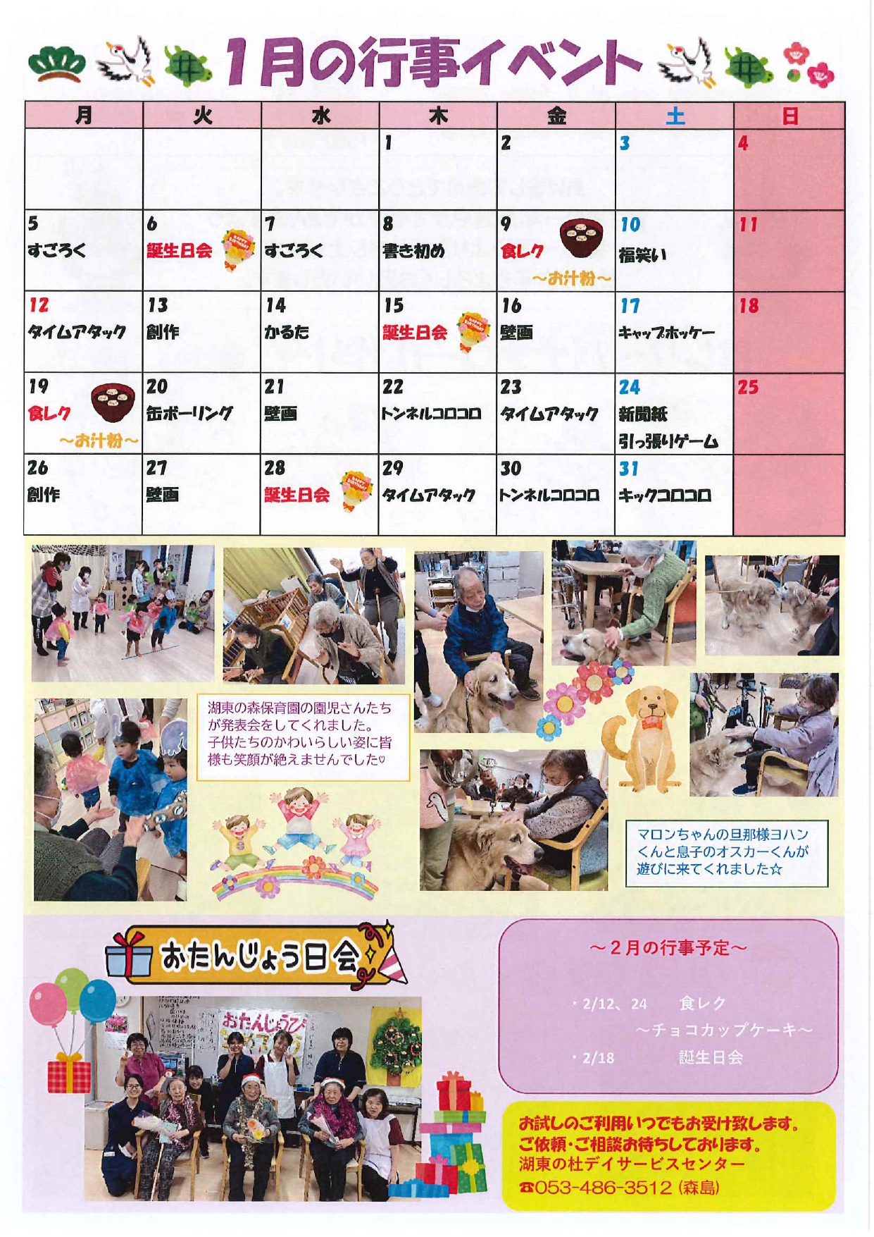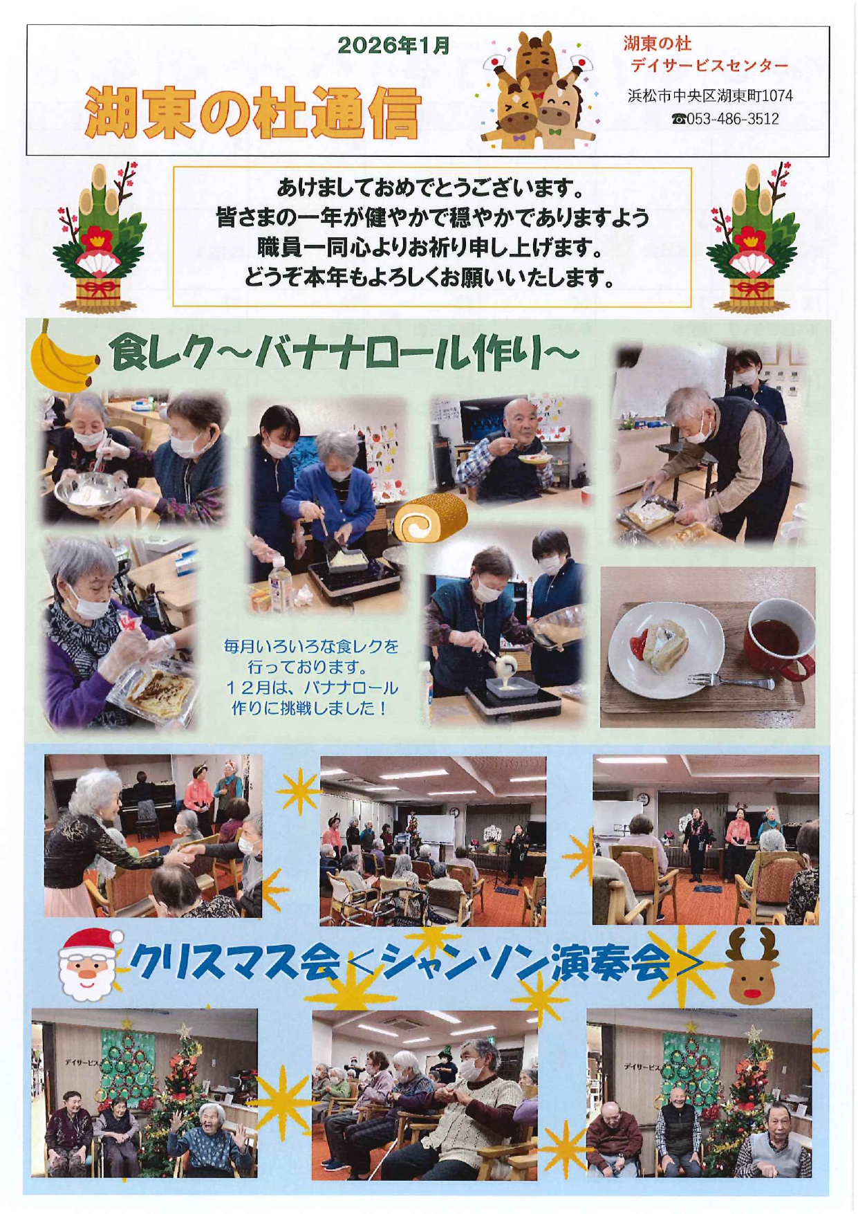 2026年がスタートしました! 2026年がスタートし早1ケ月が経とうとしております。 本年も、ご利用様が安心してお過ごしいだだけるよう、 より良いサービスのご提供に努めてまいります。 本年も湖東の杜デイサービスをよろしくお願いします。 さて、『湖東の杜通信』の1月号が完成しましたので、どうぞご覧ください。 ※クリックすると画像が拡大します
