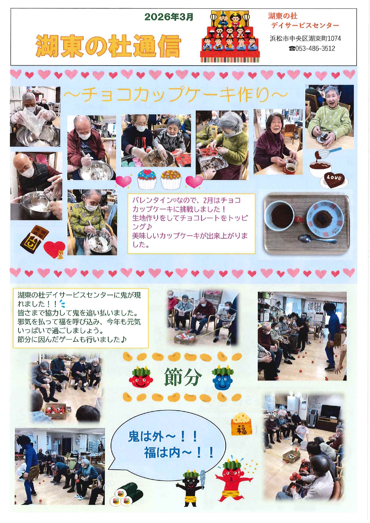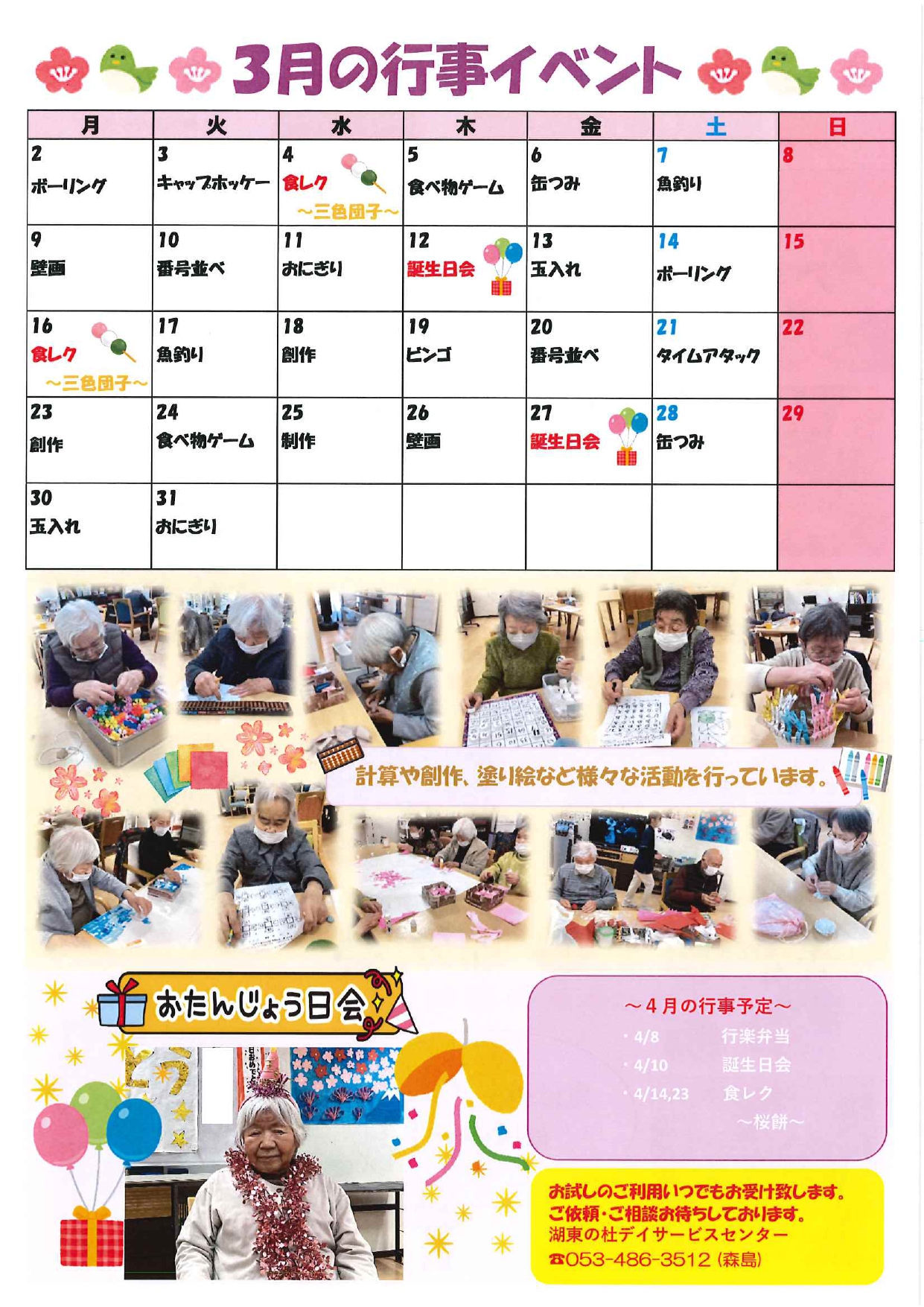 桜の花が咲く頃となりました 先日、静岡県でも桜の開花宣言がありましたね。 湖東の杜の敷地内にある桜も蕾が膨らんできました。 開花が待ち遠しいです🌸 さて、『湖東の杜通信』の3月号が完成しましたので、どうぞご覧ください。 ※クリックすると画像が拡大します 画像説明文