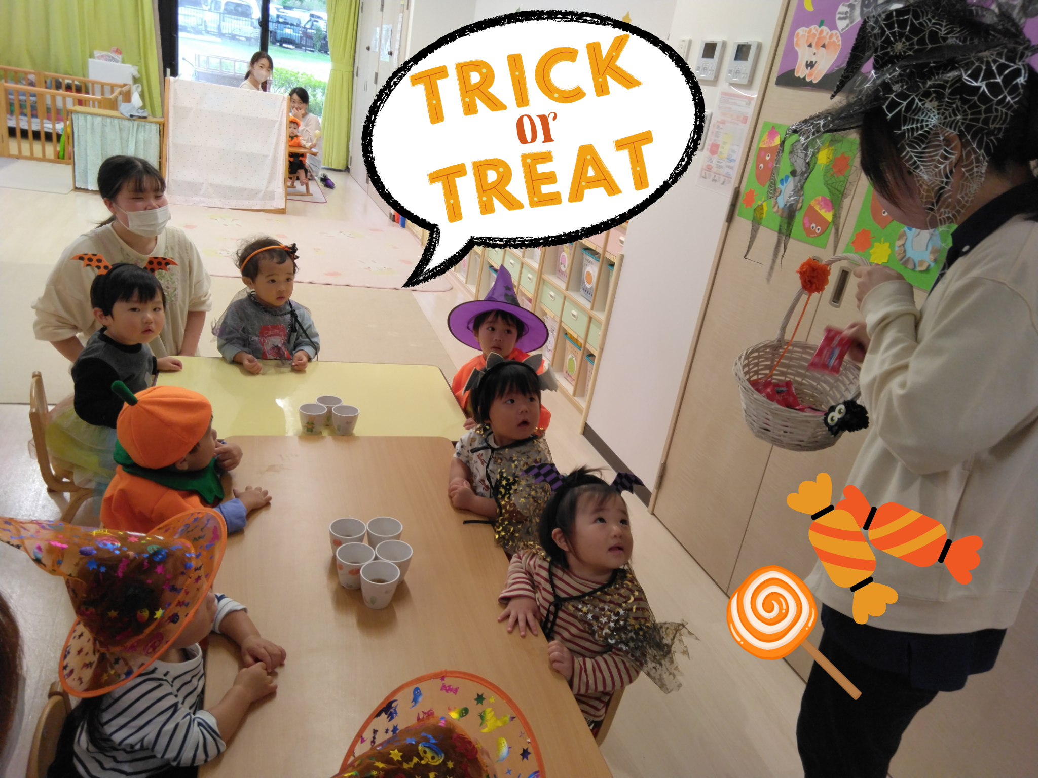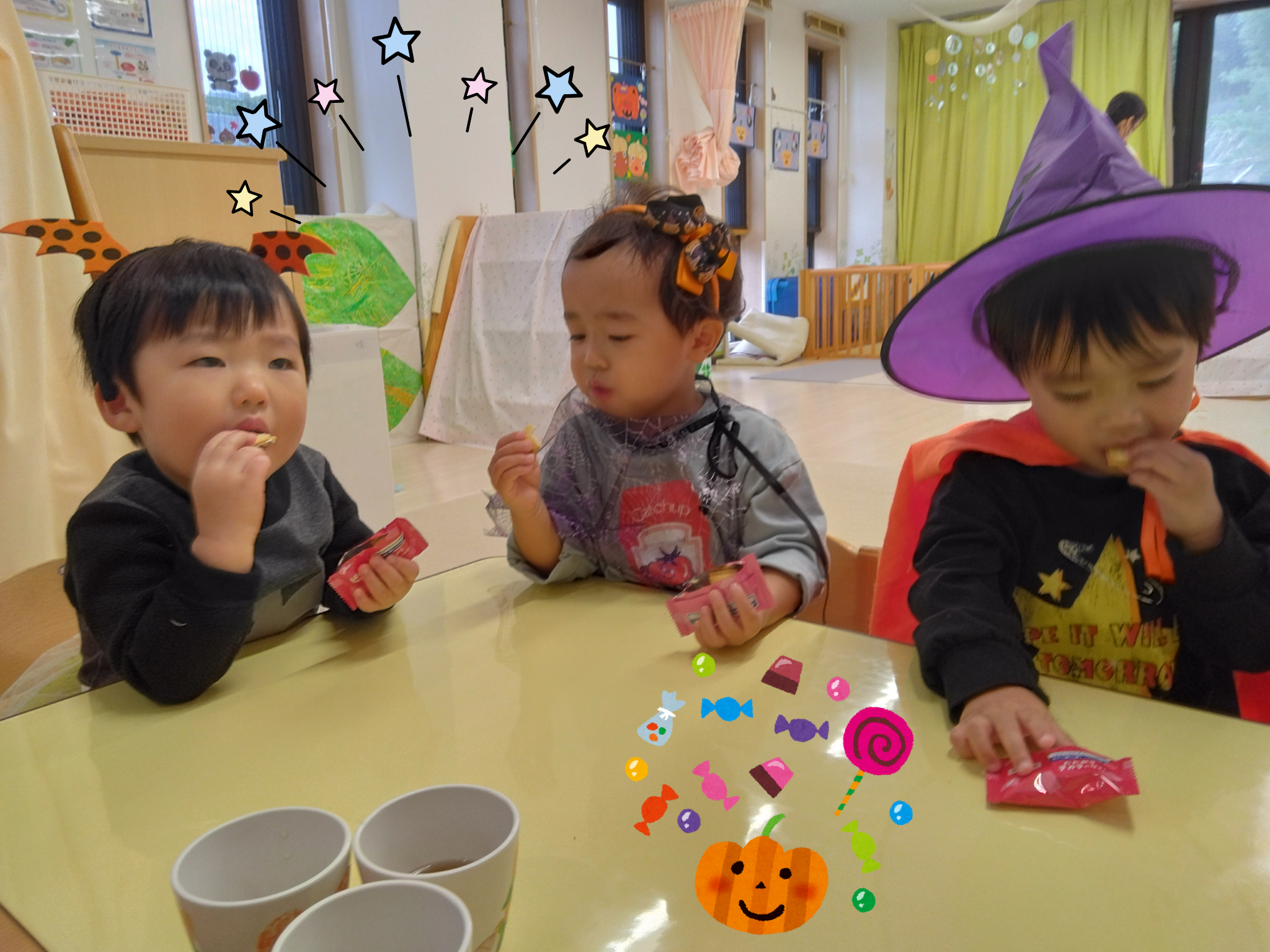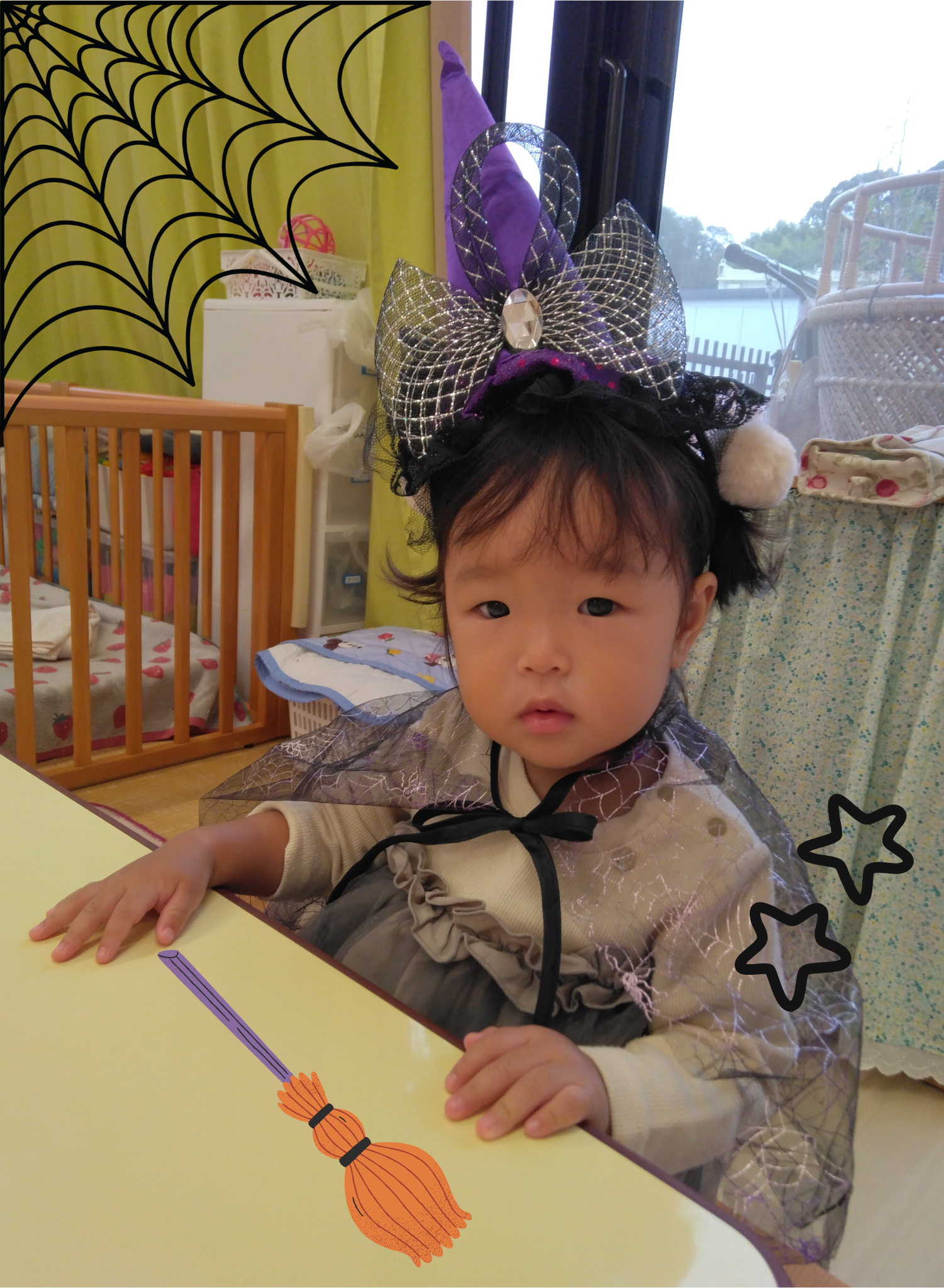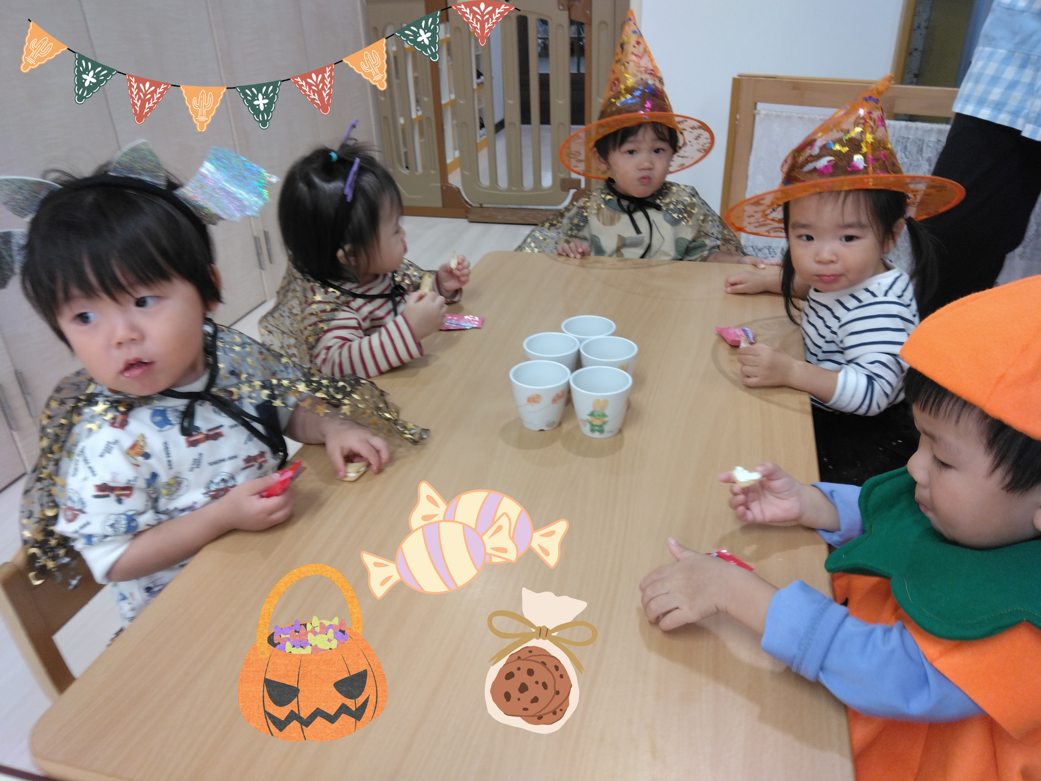 10月31日(金)ハロウィンパーティーを行いました。あらかじめ保育士が用意した仮装グッズの中から、好きな物を1人ずつ自分で選んで身に付け変身!可愛い仮装をしていたら、どこからか魔女さんが登場しました。みんなで声を合わせて「トリック オア トリート!!」と言ってみると…お菓子のプレゼントがありました❤みんなで美味しくいただいた後は、お隣の部屋のデイサービスのおじいちゃんおばあちゃんたちに可愛い姿を披露しに行って来ました。ハッピーハロウィン!とタッチをしたり、一緒に記念撮影をしたりしました。おじいちゃんおばあちゃん達からは手作りおばけのお土産もいただき、楽しい一日になりました。