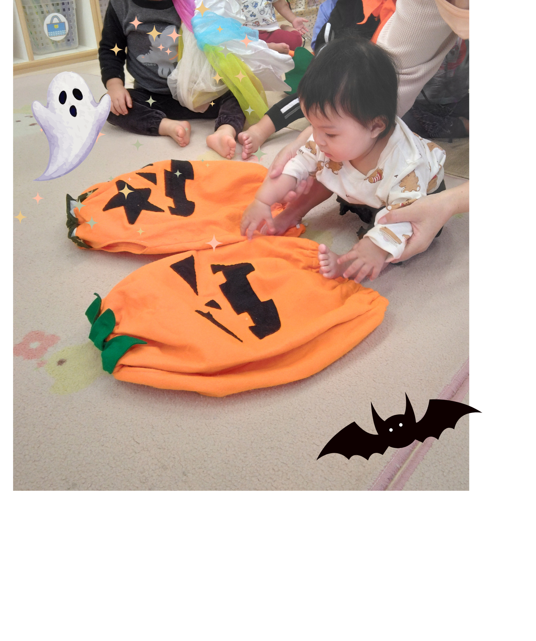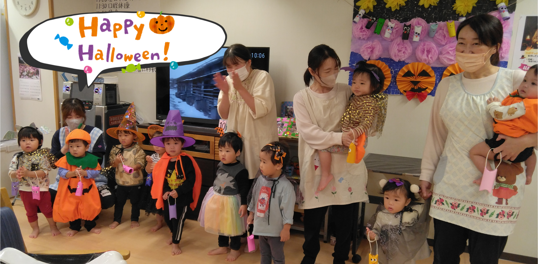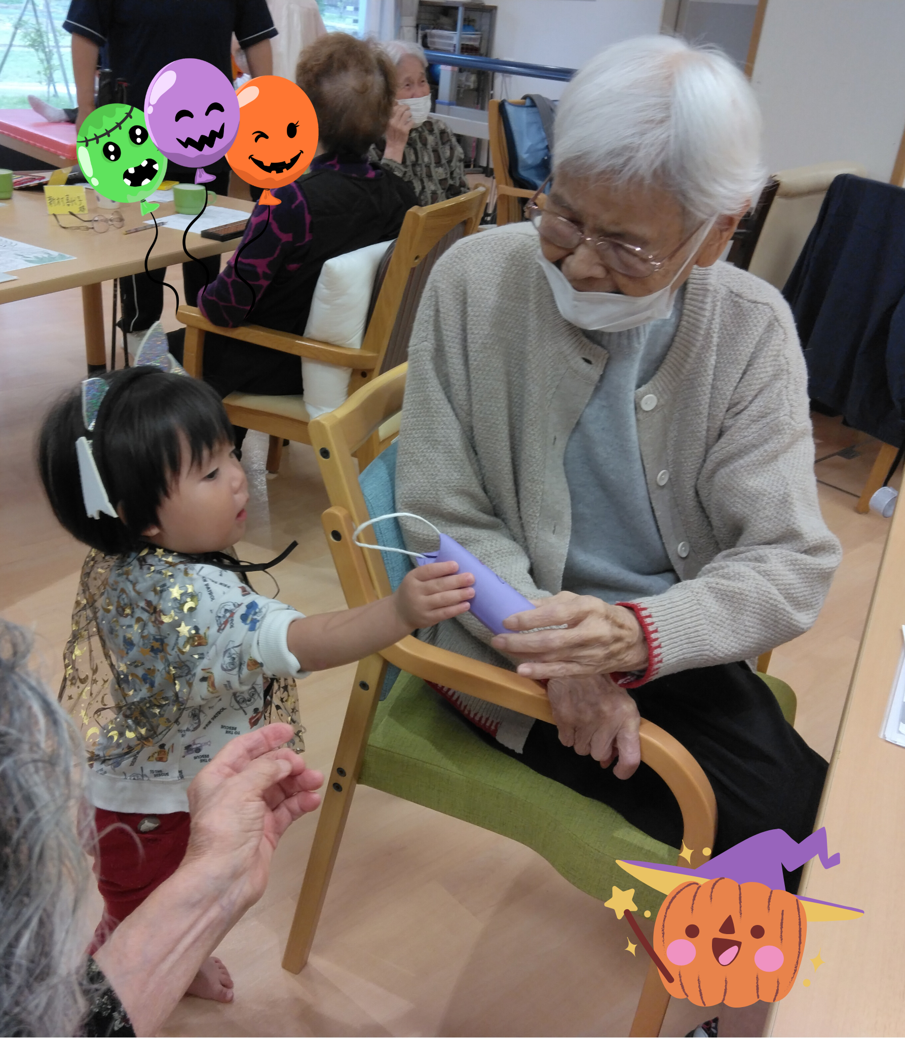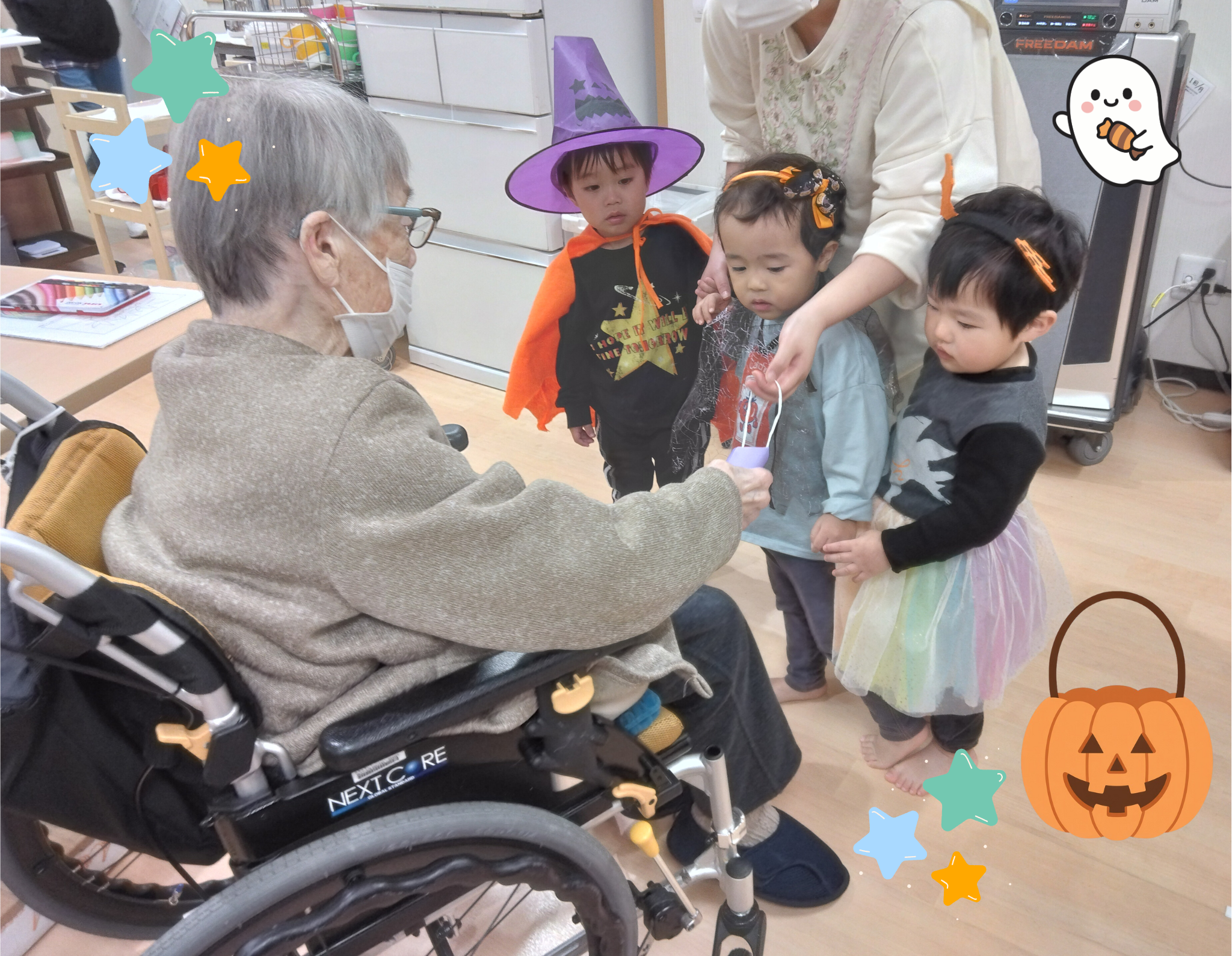 10月31日(金)ハロウィンパーティーを行いました。あらかじめ保育士が用意した仮装グッズの中から、好きな物を1人ずつ自分で選んで身に付け変身!可愛い仮装をしていたら、どこからか魔女さんが登場しました。みんなで声を合わせて「トリック オア トリート!!」と言ってみると…お菓子のプレゼントがありました❤みんなで美味しくいただいた後は、お隣の部屋のデイサービスのおじいちゃんおばあちゃんたちに可愛い姿を披露しに行って来ました。ハッピーハロウィン!とタッチをしたり、一緒に記念撮影をしたりしました。おじいちゃんおばあちゃん達からは手作りおばけのお土産もいただき、楽しい一日になりました。