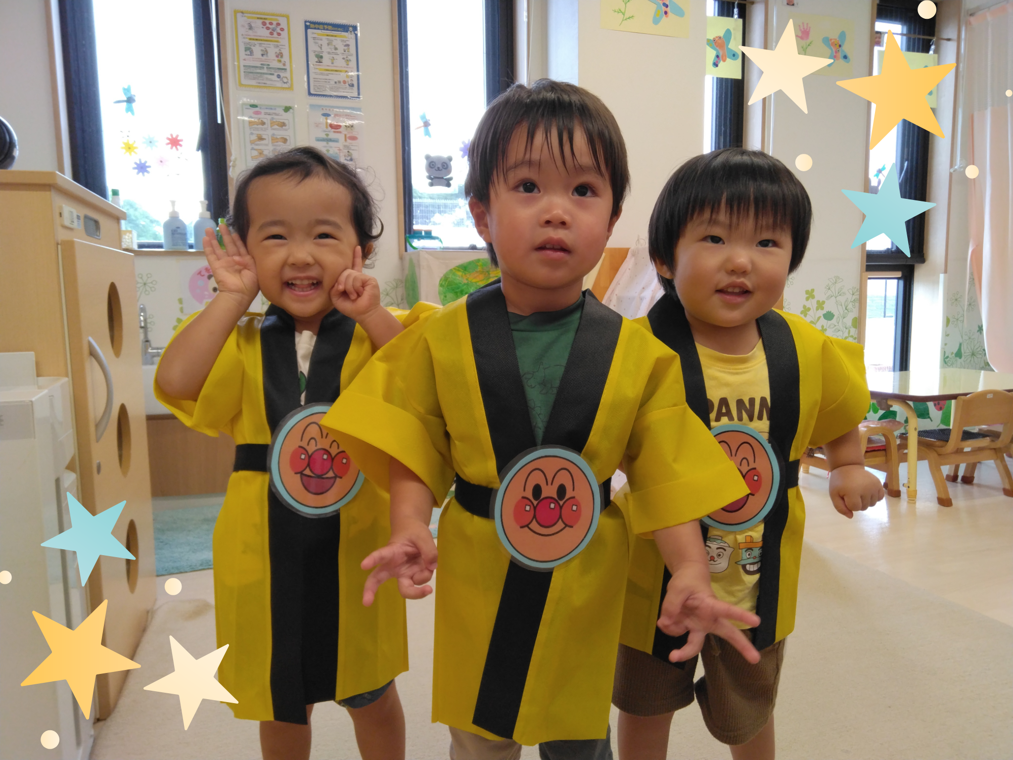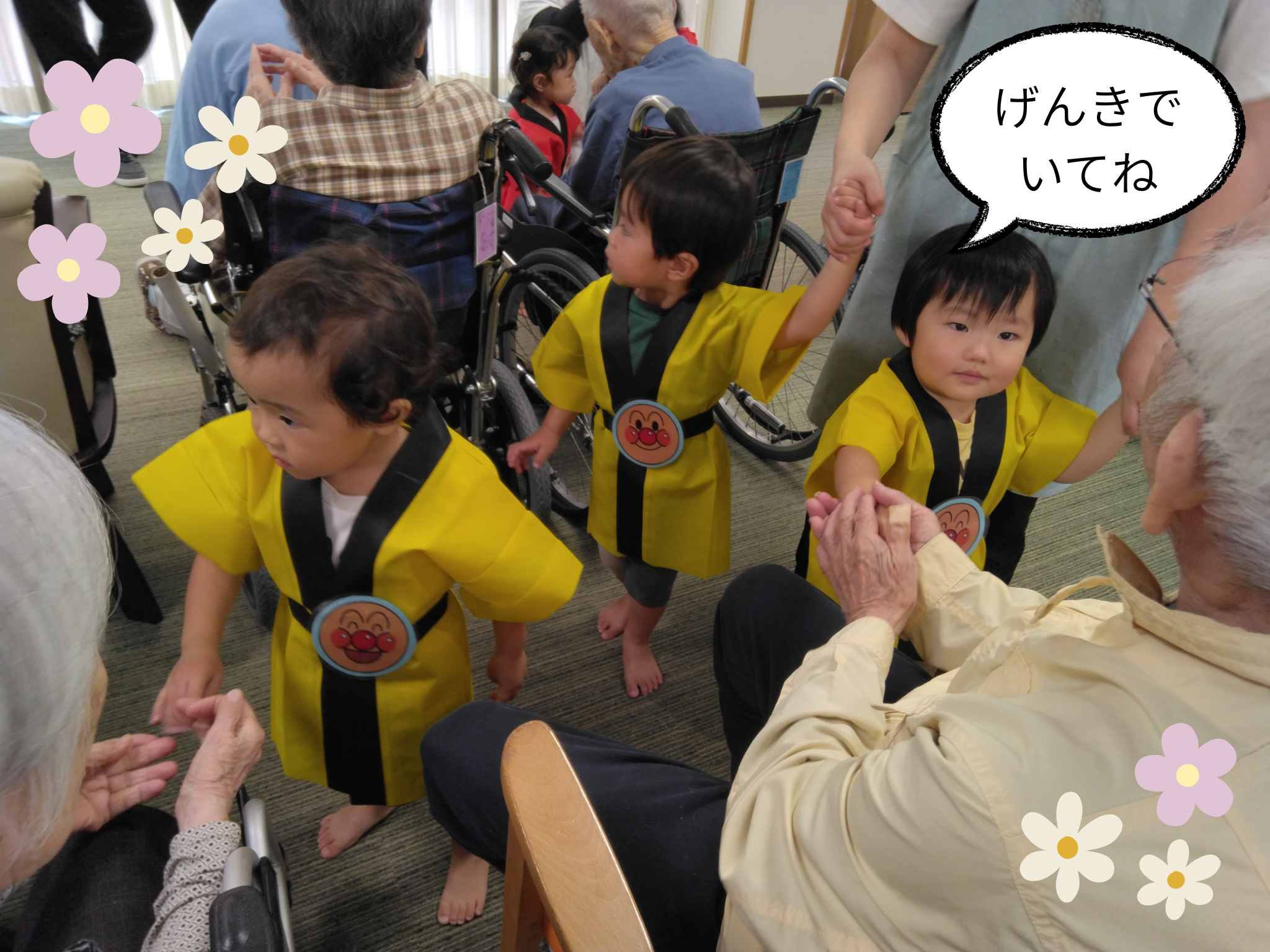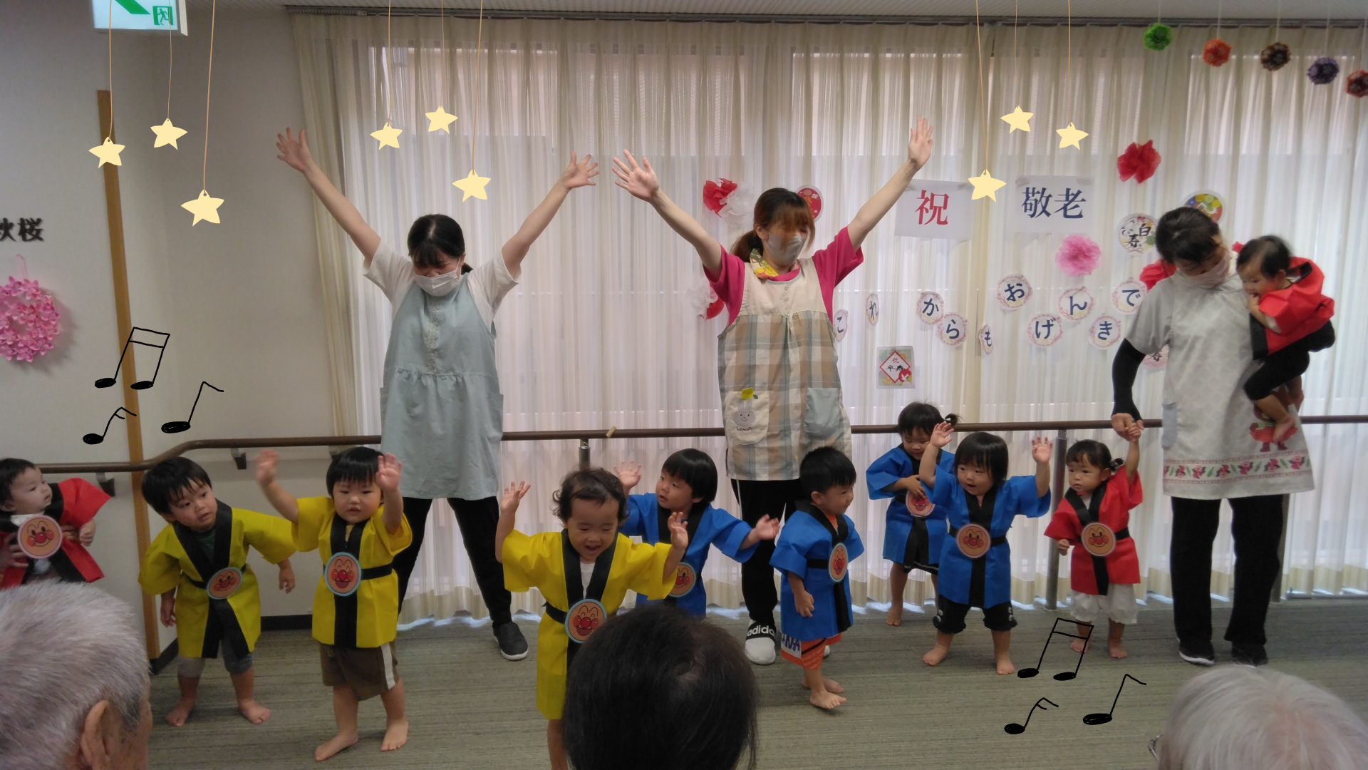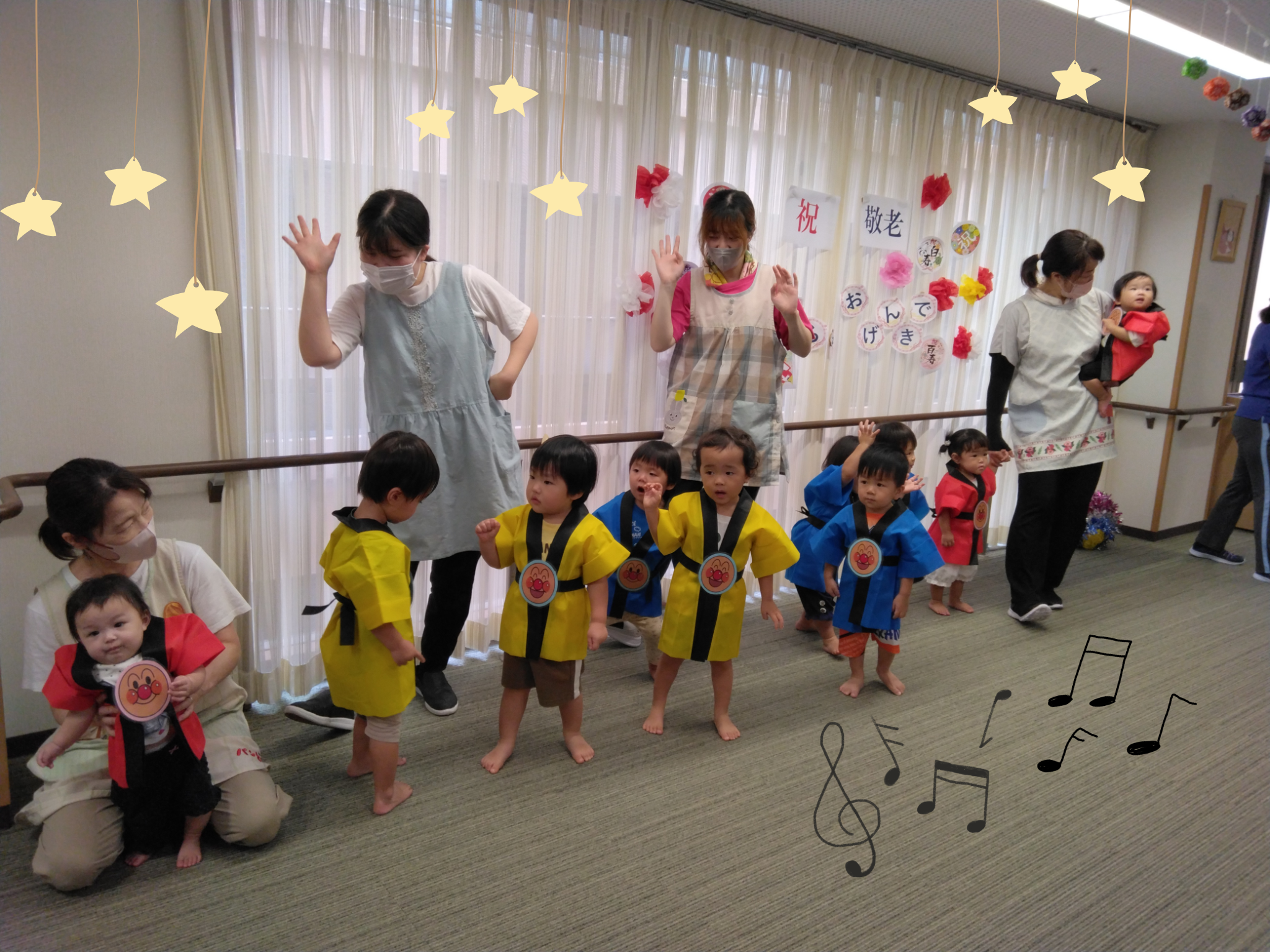 保育園に併設されている特別養護老人ホームで行われた敬老祝辞会に招待していただきました。保育園のお子様たちは色鮮やかな法被を着て、手遊び”どんぐりころころ”やみんなが大好きな”アンパンマン体操”を披露しました。大勢のおじいちゃんおばあちゃんの前では、少し固まってしまう子もいましたが、「可愛いね」「元気だね」等優しいお言葉を掛けていただくとニコニコ笑顔のお子様たち。「いつまでも元気でいてね!」と最後はタッチをしてお別れし、おじいちゃんおばあちゃん達にも喜んでいただけた一日となりました。