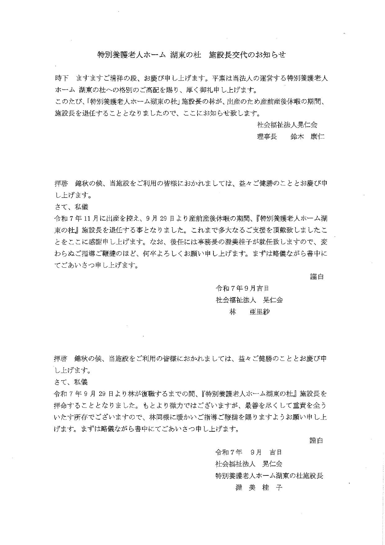 施設長交代のお知らせ 時下 益々のご清祥の段、お慶び申し上げます。平素は当法人の運営する 特別養護老人ホーム 湖東の杜への格別のご高配を賜り、厚くお礼御礼申し上げます。 このたび、「特別養護老人ホーム湖東の杜」施設長の林が、出産のため産前産後休暇の期間、 施設長を退任することとなりましたので、ここにお知らせ致します。 詳細は下記文書をご確認ください。 ※クリックすると拡大します